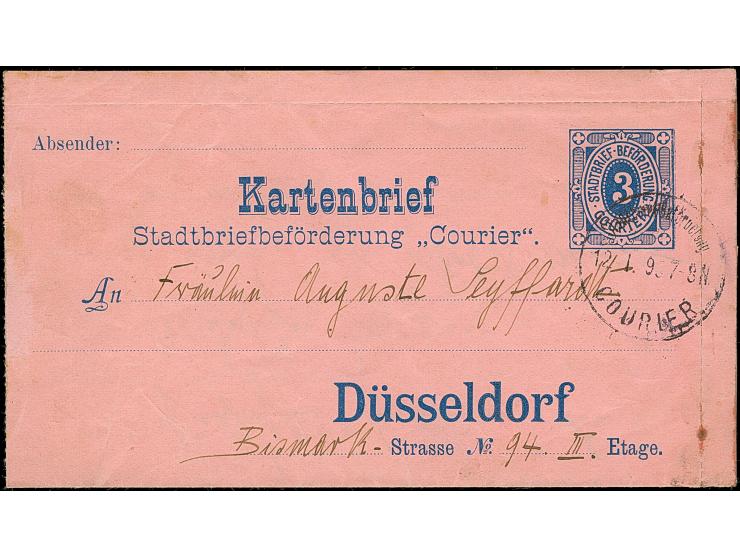 Courier: 1894, Ganzsachen-Kartenbrief 3 Pfg. mit Stempel “Stadtbrief-Beförderung COURIER 12.1895” und Text. Der Umschlag links ohne Rand und leichte Beförderungsspuren, ansonsten in guter Erhaltung