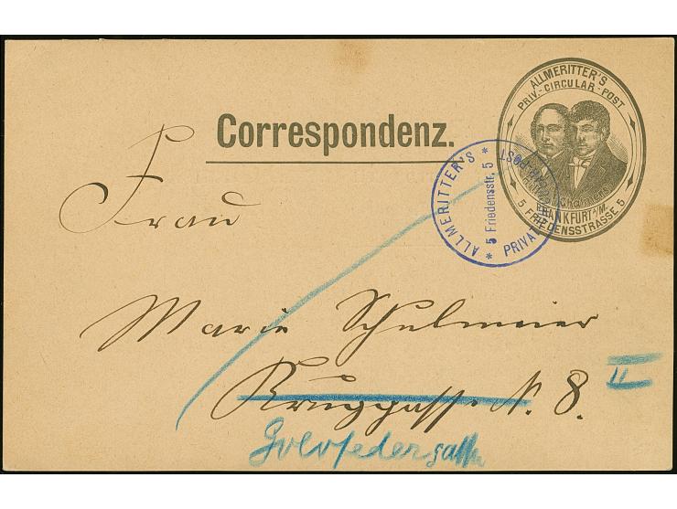 Drucksachen & Circular-Beförderung: 1889, Ganzsachen-Karte auf Privatbestellung Hill und Chalmers 2 Pfg. schwarz mit rückseitigem Zudruck “Manskopf-Stiftung” gebraucht mit violettem Stempel “ALLMERITTER'S PRIVAT-CIRCULAR-POST Friedenstr. 5”. Die Karte mit zwei kleinen Flecken, ansonsten in guter Erhaltung