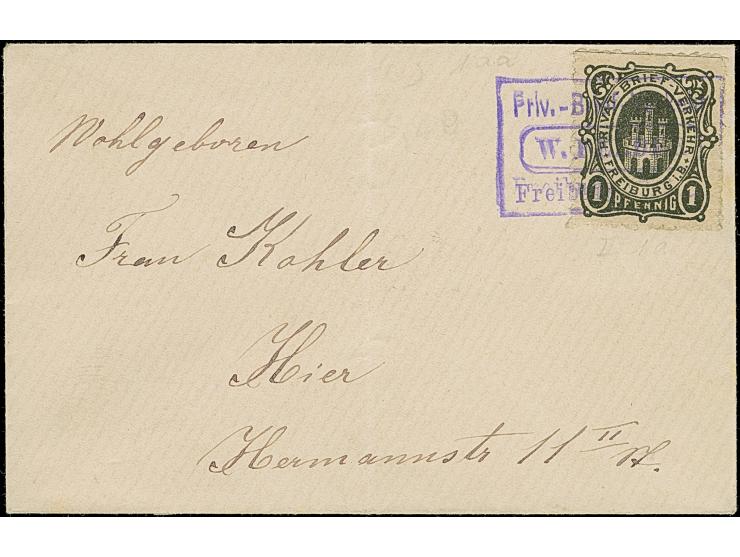 1887, 1 Pfg. schwarz durchstochen mit violettem Rahmenstempel “Priv.Brief-Verkehr Freiburg (Baden) W. Felder” auf kleinformatigem Briefkuvert, im Ortsverkehr befördert. Der Umschlag mit senkrechter Faltung, ansonsten in guter Erhaltung, selten