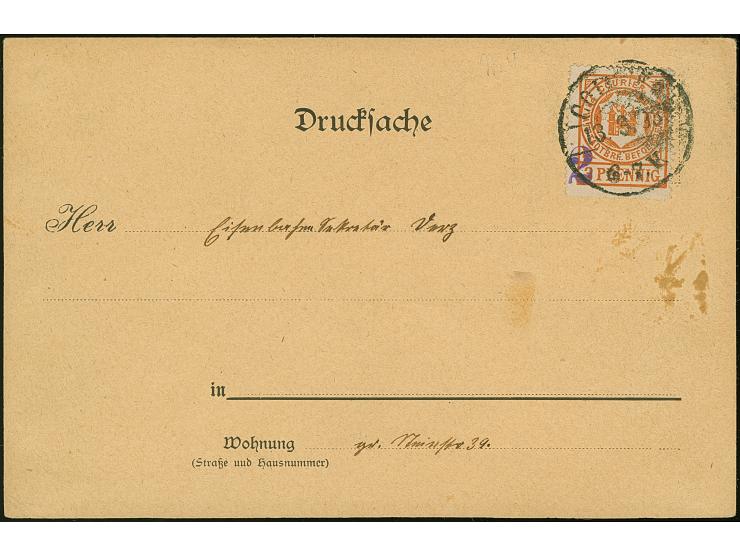 Courier: 1893, 2 auf 3 Pfg. mit violettem Aufdruck in Type I, mit Stempel “COURIER 13.3.93” auf Drucksachenkarte mit rückseitigem Text vom “Zweigverein des Evangelischen Bundes”. Die Karte mit kleinen Flecken unterhalb der Marke, ansonsten in guter Erhaltung