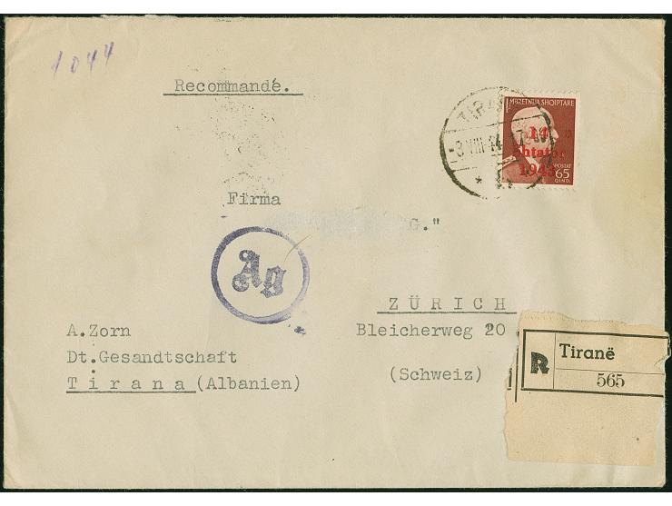 1943, 65 Qind, sauber mit Stempel “TIRANE -3- VIII-44” auf R-Brief, abgesandt von der Deutschen Gesandschaft in Tirana, nebengesetzt Zensurstempel “Ag” von Wien, nach Zürich mit rückseitigem Ankunftsstempel “ZÜRICH 21.VIII.44”. Der Empfängername ausradiert, sonst in guter Erhaltung, ein sehr seltener und attraktiver Bedarfsbrief, Fotoattest Brunel BPP (2011)