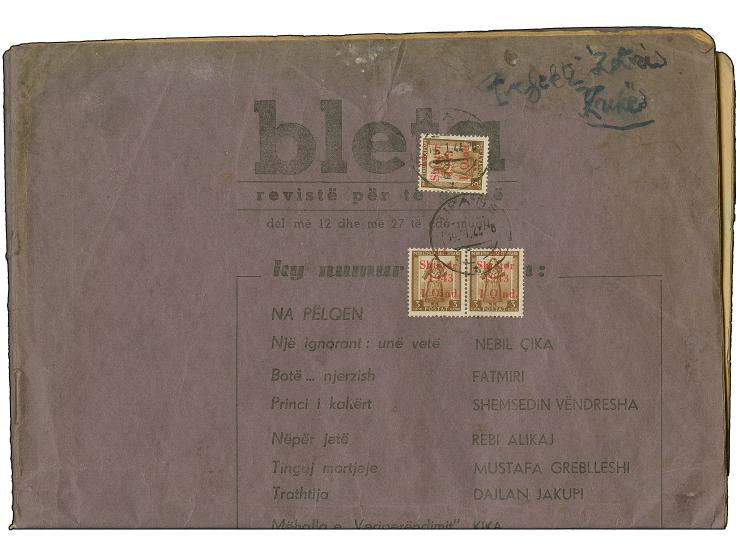 1943, 1 auf 3 Qind, waagerechtes Paar und Einzelwert, sauber mit Stempel “TIRANA 19.1.44” auf kompletter Zeitung “bleta reviste per te gijthe”, übliche Spuren, eine attraktive und seltene Verwendung
