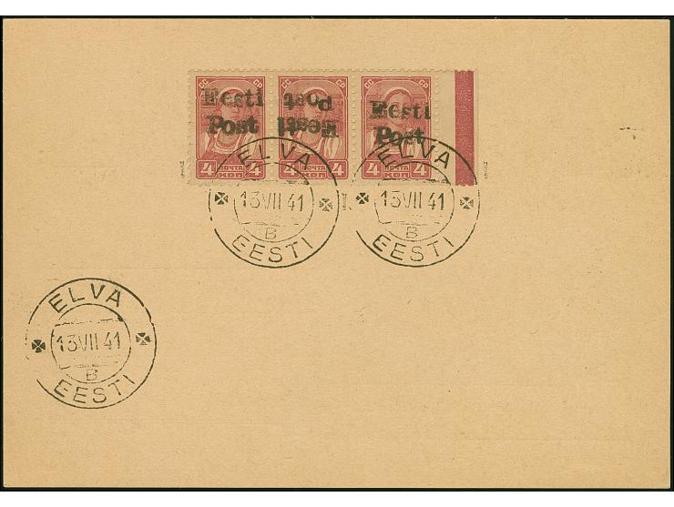 1941, 4 Kopeken, waagerechter Dreierstreifen mit rechtem Seitenrand, die mittlere Marke mit kopfstehendem Aufdruck, sauber mit Stempel “ELVA 13 VII 41” auf Blanko-Karte, umseitig bestätigt der Elwaer Postmeister R. Poll mit Unterschrift, Dienst- und Poststempel, dass die umseitige Marke echt und zeitgerecht entwertet ist, linker Wert der Normalmarke ein verkürzter Zahn, völlig belanglos, ansonsten tadellos. Eine der großen Seltenheiten, ProFi hat kein weiteres Stück dieser Abart registriert, sign. Nemvalz und Fotoattest Krischke (2001)