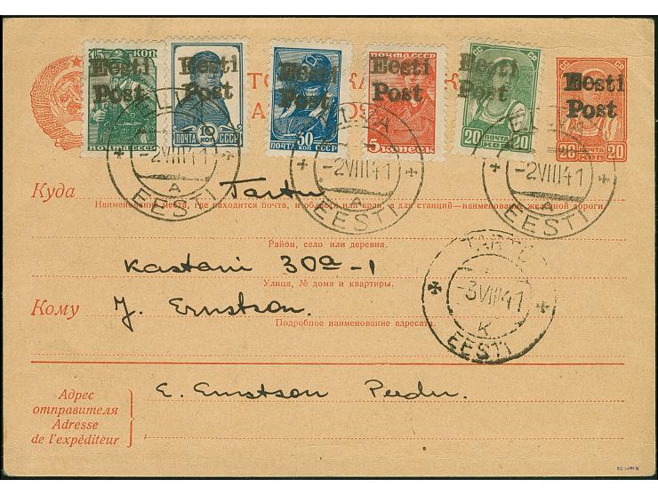Ganszachenkarte 20 Kopeken mit 5-30 Kopeken als Zufrankatur, sauber ab “ELVA -2 VIII 41” nach Tartu mit vorderseitigem Ankunftsstempel "TARTU -3 VIII 41", die 20 Kopeken war vermutlich zur Kontrolle gelöst und ist leicht versetzt wieder aufgeklebt worden, die Karte rückseitig mit viel Text, bis auf die üblichen leichten Beförderungsspuren in einwandfreier Erhaltung, Bedarfspost aus Elwa ist nur in ganz wenigen Stücken bekannt, sign. Vaher und Fotoattest Löbbering BPP (2010)