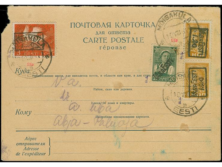 1941, 1,20 auf 1 Kopek orange, senkrechtes Kehrdruckpaar, zusammen mit 1,20 auf 3 S. orange und 20 Kopeken grün, mit Stempel “MOISAKÜLA 10 VIII 41” auf russischer Ganzsachenkarte, rückseitig datiert “Moiseküla 10.08” mit interessantem Text “…Ich bin mit dem Fahrrad an der lettischen Grenze im Norden….Wenn die Umstände sich bessern, komme ich zu Besuch.”, die Ganzsachenkarte kleiner Eckfehler, leichte Altersspuren, sonst tadellos, eine der ganz großen Seltenheiten, die 3 S. mit nur einer Auflage von 80 Stück, ProFi hat keinen weiteren senkrechten Kehrdruck registriert, sign. EKeiler mit Fotoattest (1967)