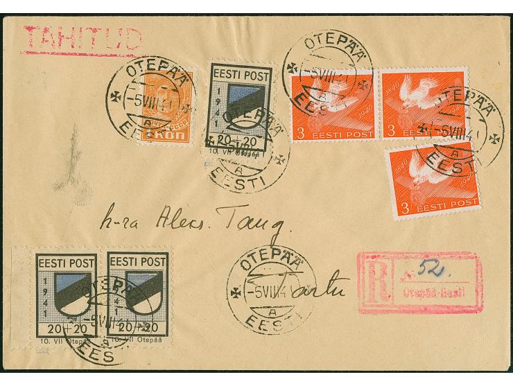 1941, Wappenschild 30 Kopeken, gezähnt, Type II, waagerechtes Seitenrandpaar und Einzelmarke, zusammen mit nicht gültiger russischer und estnischer Frankatur, mit Stempel “OTEPÄÄ -5 VIII 41” auf portogerechtem R-Brief nach Tartu mit Ankunftsstempel, tadellos, ein außergewöhnlicher und attraktiver Brief, sign. Sieger sowie Fotoattest Krischke BPP (1993)