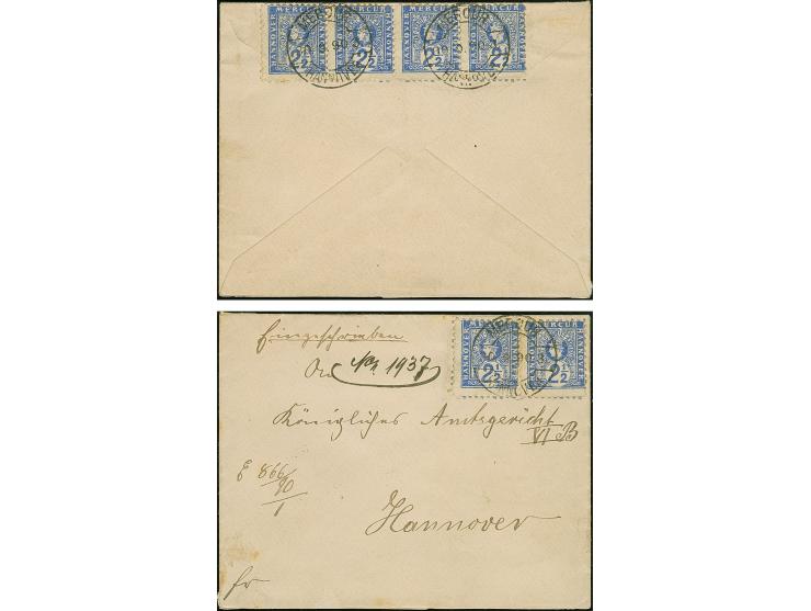 Mercur: 1889, 2½ Pfg. blau, zwei Einzelmarken vorderseitig und im waagerechten Viererstreifen rückseitig je mit Stempel “MERCUR HANNOVER 30.9.90” als tarifgerechte Mehrfachfrankatur auf R-Ortsbrief an das Amtsgericht in Hannover, in einwandfreier Erhaltung. Eine außergewöhnliche seltene Mehrfachfrankatur