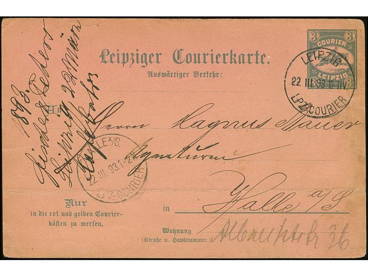 Courier: 1893, Ganzsachenkarte 3 Pfg. mit Stempel "LEIPZIG LPZ. COURIER" 22.III.93" mit viel Text nach Halle a. Saale mit vorderseitigem Ankunftsstempel “HALLE A/S LPZ.-COURIER 22.III.93.”. Die Karte mit kleinen Randspuren und unten mit stärkerer waagerechter Faltung. Trotz der Einschränkungen ein sehr seltene Verwendung nach Halle vor April 1894. Die Leipziger Zweigniederlassung in Halle bestand nur vom 9.3.1893 bis Anfang April, dann wurde ein Kartellverhältnis mit dem Courier aus Halle abgeschlossen und die Zweigniederlassung übernommen. In dieser Form mit dem Ankunftsstempel sehr selten