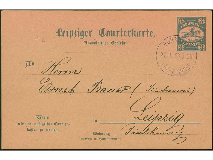 Courier: 1893, Ganzsachenkarte 3 Pfg. mit violettem Stempel “BORSDORF LPZ.-COURIER 27.III.93” und Text mit Firmenstempel “Verblendsteinwerke E. Kreuzschmann” nach Leipzig in einwandfreier Erhaltung. Eine sehr seltene Verwendung aus Borsdorf