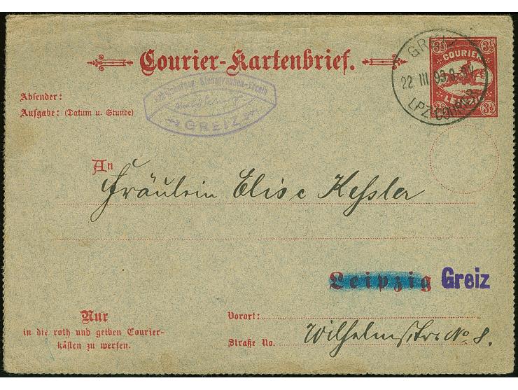 Courier: 1893, Ganzsachen-Kartenbrief 3½ Pfg. mit Stempel “GREIZ LPZ.-COURIER 22.III.93” und Text, im Ortsverkehr befördert mit violettem L1 “Greiz” in der Anschrift. Der Kartenbrief ist ohne Ränder und hat Beförderungsspuren im Rand, eine seltene Verwendung dieser Ganzsache in Greiz