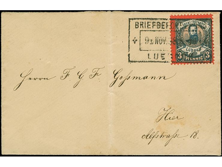 Local-Verkehr: 1888, Kaiser Friedrich III. 3 Pfg. mit Stempel “BRIEFBEFÖRDERUNG LÜBECK 9t. NOV.88” auf Ortsbriefkuvert. Der Umschlag mit senkrechter Faltung, ansonsten in guter Erhaltung, selten