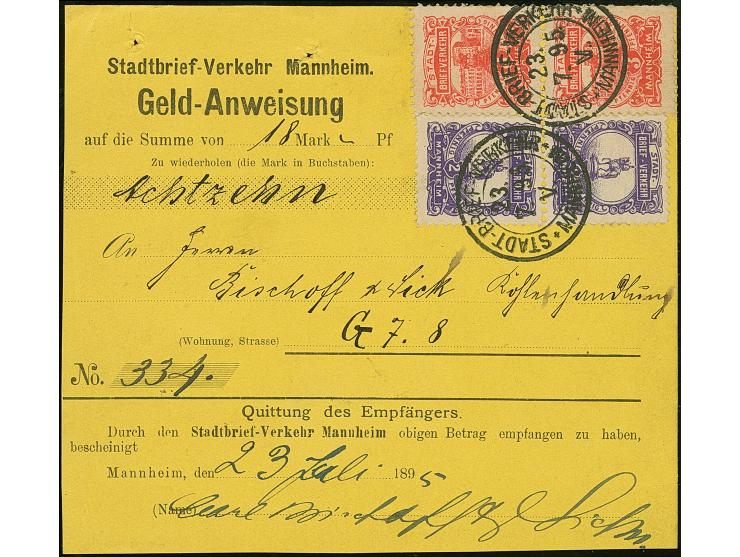 Stadt-Brief-Verkehr: 1895, 3 Pfg. rot und 2 Pfg. violett jeweils im senkrechten Paar mit Stempel “STADT-BRIEF-VERKEHR MANNHEIM 23.7.95” vorder- und rückseitig auf einer Geld-Anweisung über 18 Mark. Die oberen Marken mit stärkeren Zahnfehlern durch Randklebung, ansonsten in guter Erhaltung. Eine sehr seltene Verwendung der 3 Pfg. rot auf einer Geld-Anweisung