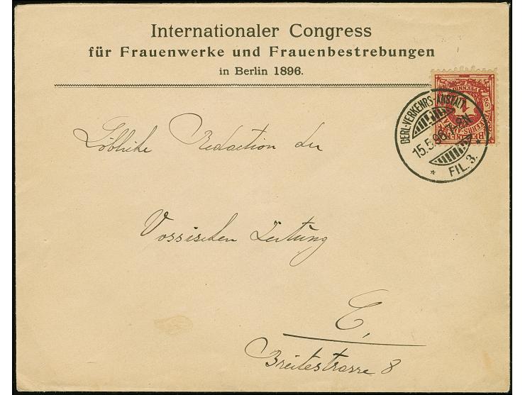 Berliner Verkehrs-Anstalt: 1895, 1 Pfg. karmin mit klarem Stempel “BERL.-VERKEHRS-ANSTALT FIL.3 15.5.96” auf Vordruckbrief “”Internationaler Congress für Frauenwerke und Frauenbestrebungen in Berlin 1896" , in guter Erhaltung