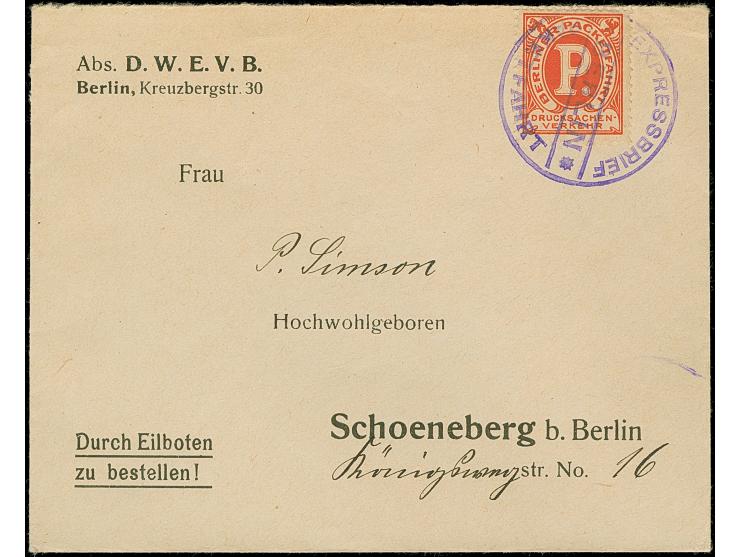 Berliner Paketfahrt-Gesellschaft: 1907, Drucksachen-Verkehr-Marke rot gez. 13¾:14 mit violettem Stempel “EXPRESSBRIEF PAKETFAHRT BERLIN” auf Vordruckbrief mit gedrucktem Vermerk “Durch Eilboten zu bestellen” nach Schöneberg, in guter Erhaltung