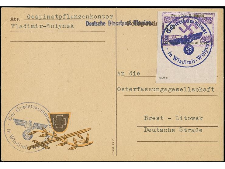 1944, Wladimir-Wolynsk 6 Pfennig, Unterrandstück, breitrandig ungezähnt mit Dienstiegel-Entwertung auf nach Brest-Litowsk adressierter Karte, tadellos, sign. Keiler BPP