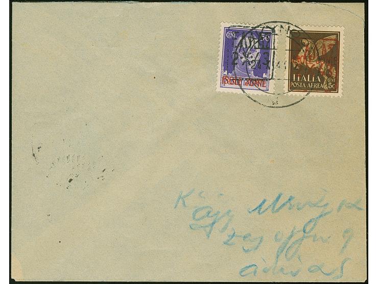 1943, Flugpost 50 Centesimi mit rotem Aufdruck sowie 50 Centesimi schwarzviolett mit schwarzem Aufdruck, sauber mit Stempel "ZAKYNTHOS 24.X.43" auf Brief nach Athen mit Ankunftsstempel, tadellos, sehr selten, Fotoattest Krischke (2001)