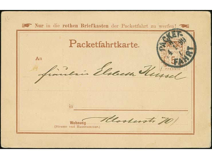 Berliner Packetfahrt-Gesellschaft: 1899, Ganzsachenkarte 5 Pfg. mit rückseitigem Bild “Kaiser Wilhelm II.” (Bild No. 46) gebraucht mit Stempel “PACKET FAHRT 4.1.99”. Die Karte mit kleinen Randspuren bzw. Eckbug, ansonsten in guter Erhaltung. Gebrauchte Karten sind selten