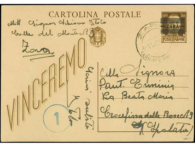 1943, Ganzsachenkarten 30 Centesimi ab “ZARA ARRIVI E PARTENZE 24.11.43” nach Spalato, tadellos, sign. Ludin BPP