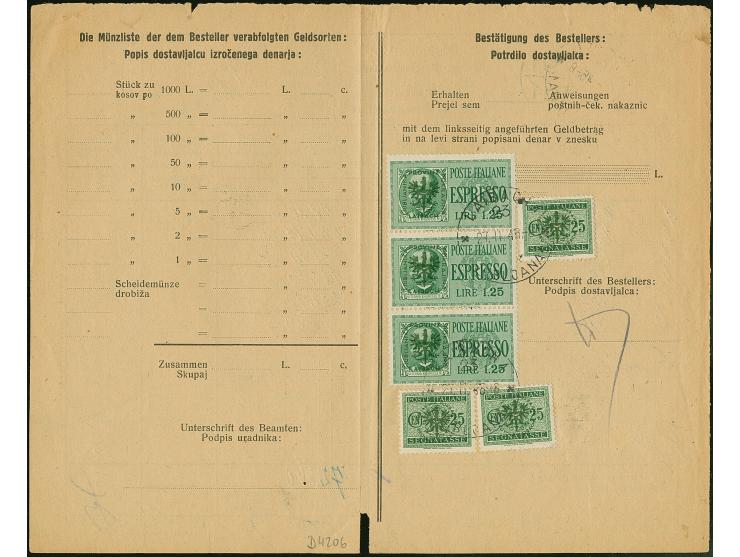 1944, Eilmarke 1,25 Lire, senkrechter Dreierstreifen und drei Einzelwerte Porto 25 Centesime, mit Stempel "LAIBACH 23 27.II.45" rückseitig auf kleinem Formular "Bestellkarte für Postanweisungen" (P 90a), übliche Faltung im Formular, sonst in guter Erhaltung