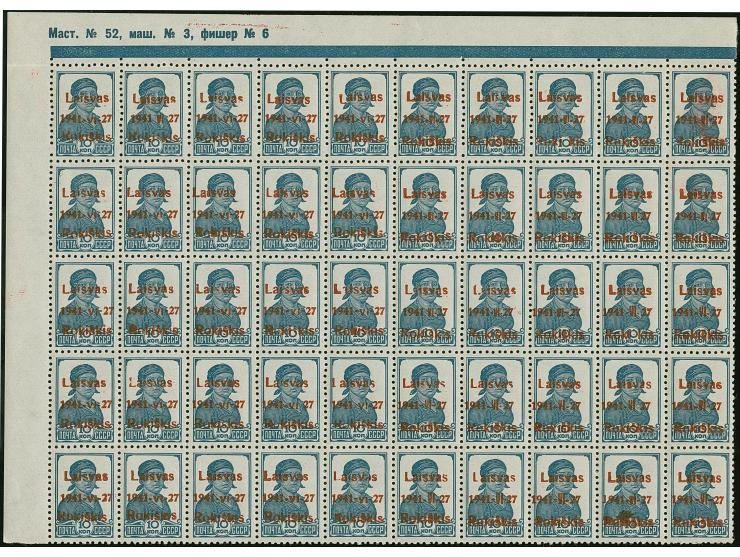 Aufdruck braunrot: 10 Kopeken, kompletter Bogen, oben mit komplettem Druckvermerk, postfrisch, ein Wert mit großem, herstellungsbedingten Einschluß, tadellos
