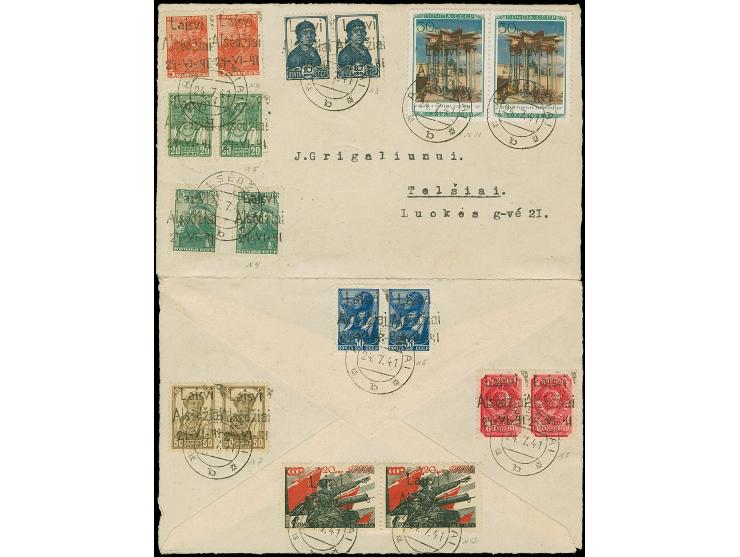 1941, Usbekische SSR 30 Kopeken zusammen mit Rote Arme 1 Rubel sowie Freimarken 5-60 Kopeken, bis auf 15 Kopeken je im waagerechten Paar, alle Marken farbfrisch und gut bzw. ausgabetypisch gezähnt, sauber mit Stempeln "ALSEDZIAI 24.7.41" auf dreiseitig geöffnetem Umschlag, die beiden Briefhälften getrennt und mit Falzen fixiert, adressiert an den bekannten Empfänger “J. Grigaliunui” in Telschen. Eine der großen Seltenheiten, von dem Wert Usbekische SSR hat ProFi lediglich 5 Stück registriert, der Wert zu 1 Rubel ist aufgrund der geringen Auflage ebenfalls sehr selten, ausführliches Fotoattest Krischke (2010) sowie Fotoattest Huylmans BPP (2026)