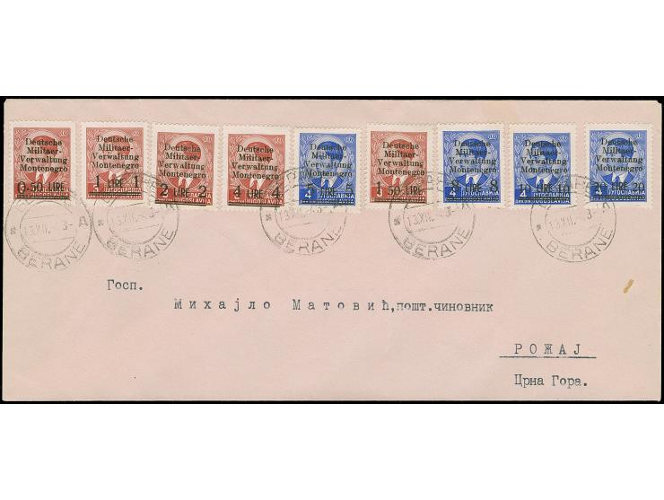 1943, 0,50-20 Lire, sauber mit Stempel “BERANE 13.XII.43” auf nach Rozaj adressierten Umschlag mit Ankunftsstempel, tadellos