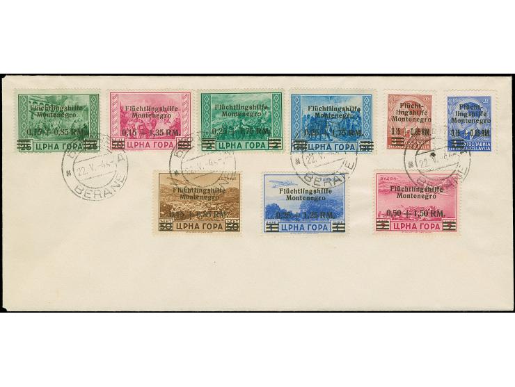 1944, Flüchtlingshilfe 0,15+0,85 auf 3 Dinar - 0,50+1,50 auf 2 Lire, sauber mit Stempel “BERANE 22.V.44” auf Blanko-Umschlag, tadellos, Befund Brunel BPP (2008)