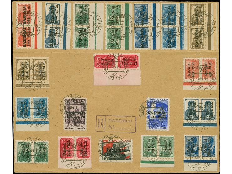 1941, 5-60 Kopeken, in waagerechten Paaren, Aufdrucktype I, sowie 5-50 Pfennig in senkrechten Paaren, Aufdrucktype III, sowie 80 Kopeken Allunionsausstellung und Majakowski sowie Rote Armee 1 Rubel, sauber mit kyrillischen Stempel “24 8 41” auf Blanko-Briefteil, teils winzig unregelmäßig gezähnt bzw. winzig fleckig, sonst tadellos, sign. Keiler BPP