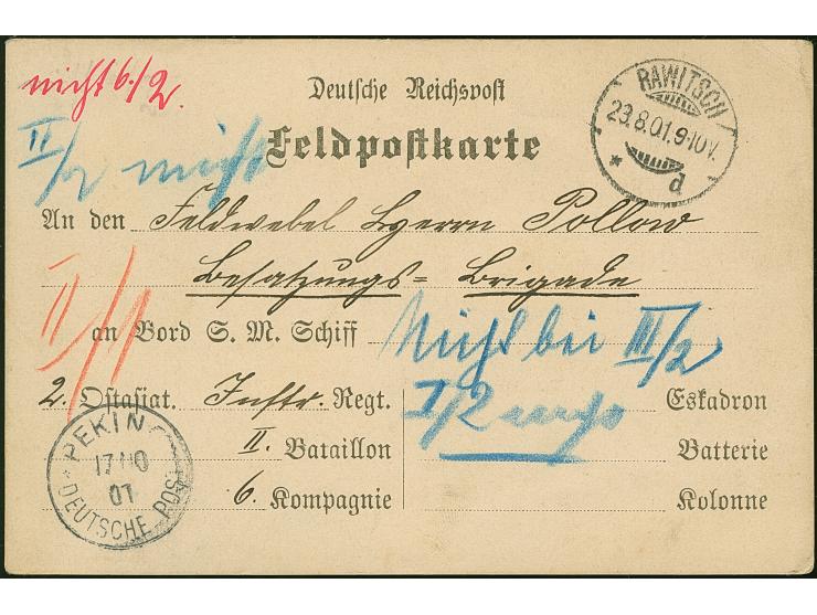 1901, Feldpostkarte-Vordruckkarte aus “RAWITSCH 28.8.01” an einen Feldwebel in China mit Ankunftsstempel “PEKING DP 17.10.01” und verschiedenen Vermerken über versuchte Zustellungen bei verschiedenen Einheiten, in guter Erhaltung