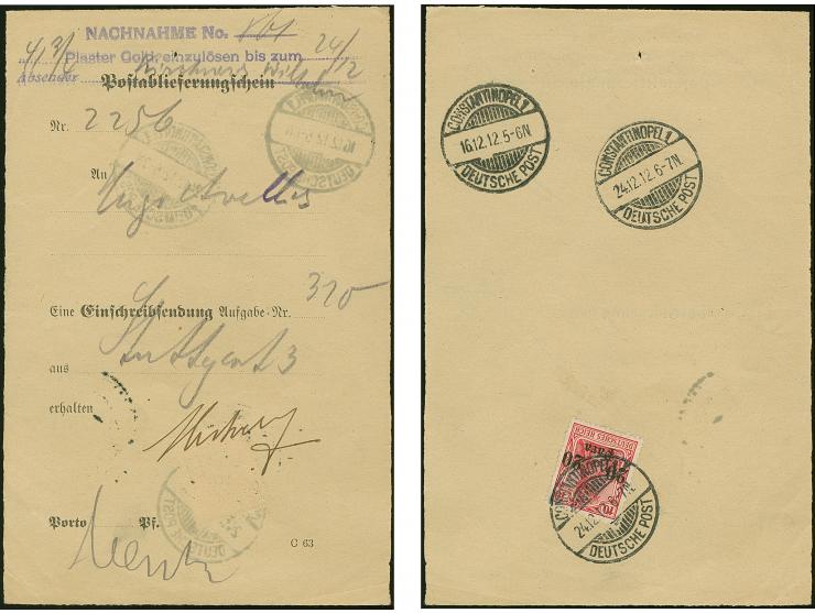 1905, 20 Pa. auf 10 Pfg. mit Wasserzeichen, mit Stempel “CONSTANTINOPEL DP 24.12.12” rückseitig auf Postablieferungsschein für eine Nachnahmesendung und für eine Einschreibe-Sendung aus Stuttgart (Formular C.63). Das Formular hat kleine Randspuren, sonst in gute Erhaltung