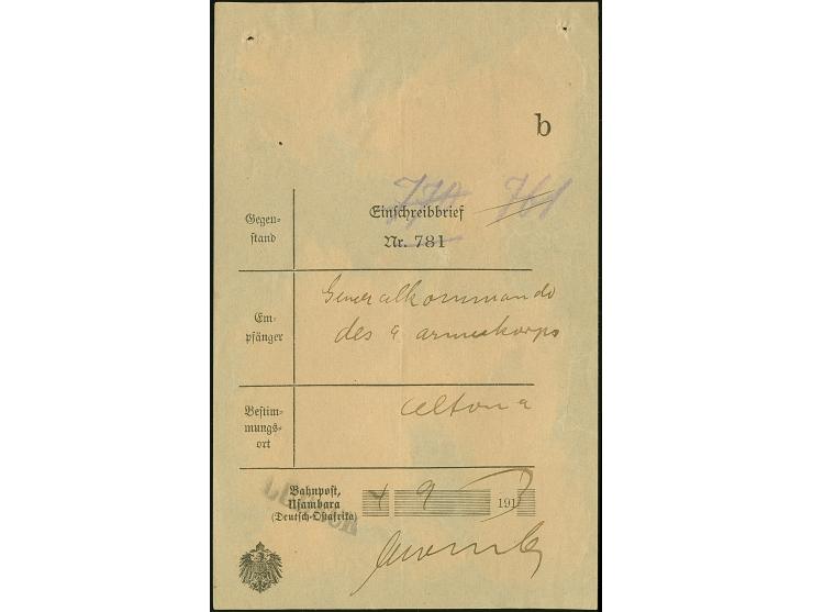 1913, “Bahnpost, Usambara (Deutsch-Ostafrika)”, Post-Einlieferungsschein im Reichsgebiet verwendet mit L1 “LÜBECK” für einen R-Brief an das Generalkommando der XI. Armee nach Altona. Das Formular rückseitig mit Papierresten und mit zwei Nadellöchern oben, ansonsten in guter Erhaltung. Eine seltene Verwendung