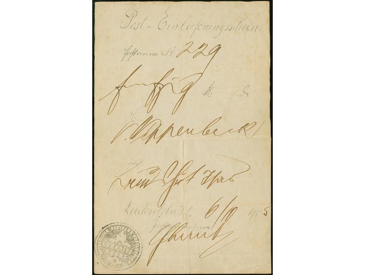 1906, provisorischer Posteinlieferungsschein für eine Postansweisung von Lüderitzbucht (6.6.1905) mit Dienstsiegel. Das Formular wurde mehrfach gefaltet, ansonsten in guter Erhaltung. In dieser Form sehr selten
