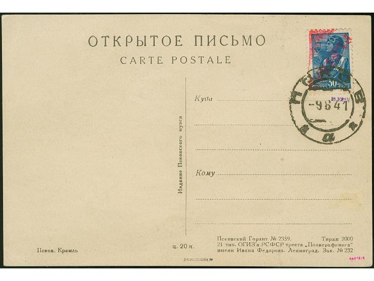 1941, “PLESKAU” schräger Handstempelaufdruck von links unten nach rechts oben in dunkelrosarot, 30 Kopeken mit kopfstehendem Aufdruck, sauber mit Stempel “PSKOV 9 8 41” auf Blanko-Ansichtskarte “Kathedrale von Pleskau”, tadellos, sehr selten. ProFi hat nur einen weiteren Brief mit kopfstehendem Aufdruck registriert, sign. Bartels sowie Dr. Rommerskirchen BPP mit Fotoattest (1981)