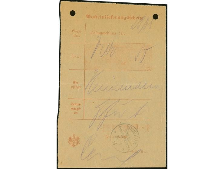 “WINDHUK DSWA *b 11.11.13” klar auf Posteinlieferungsschein für eine Postanweisung. Das Formular mit waagerechter Faltung und Aktenlochung oben, ansonsten in guter Erhaltung