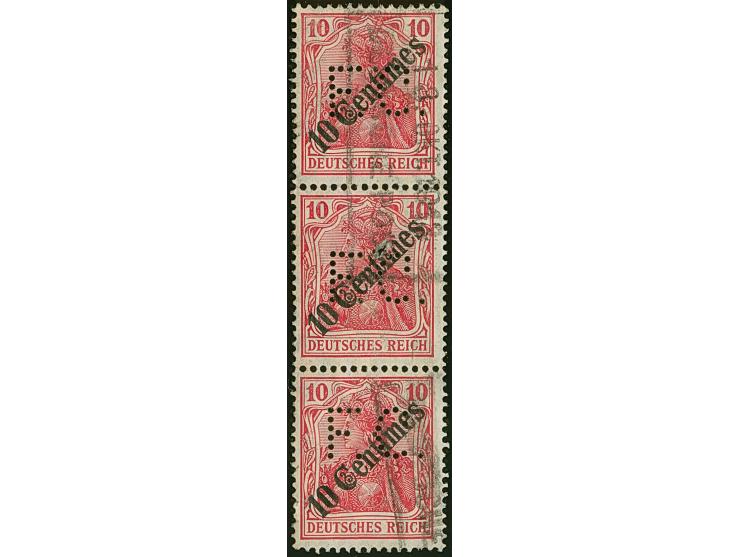 “SMYRNA DEUTSCHE POST 13.OKT.1913”, sogen. Rosinenstempel ohne Sterne, zwei Teil-Abschläge auf senkrechtem Dreierstreifen Ausgabe 1908 10 C. auf 10 Pfg. jeweils mit Firmenlochung “F.C.”. Die Einheit ist üblich gezähnt und vorgefaltet, die untere Marke hat eine kleine Kerbe, ansonsten in guter Gesamterhaltung