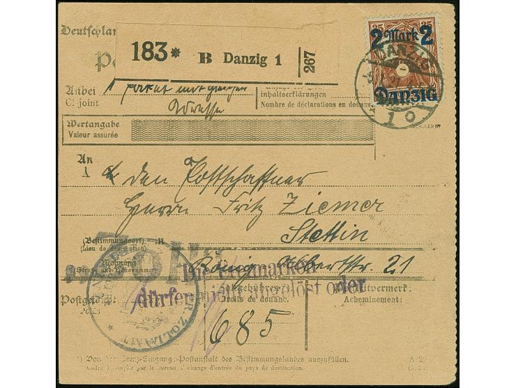 1920, 2 Mark auf 35 Pfennig, Spitzen nach oben, sauber mit Stempel “DANZIG -5.1.21” auf Paketkarte nach Stettin mit Ankunftsstempel, Marke mit Kontrollochung, tadellos, sign. Infla