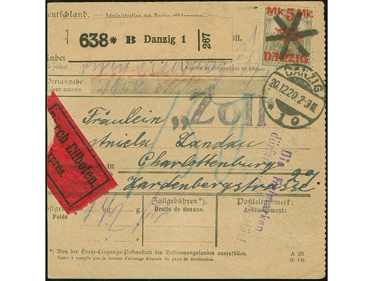 1920, 5 Mark auf 2 Pfennig, Spitzen nach oben, sauber mit Stempel “DANZIG 20.12.20” bzw. Korkstempel auf Eil-Wertpaketkarte nach Charlottenburg mit Ankunftsstempel, leichte Beförderungsspuren, sonst tadellos, sign. Infla