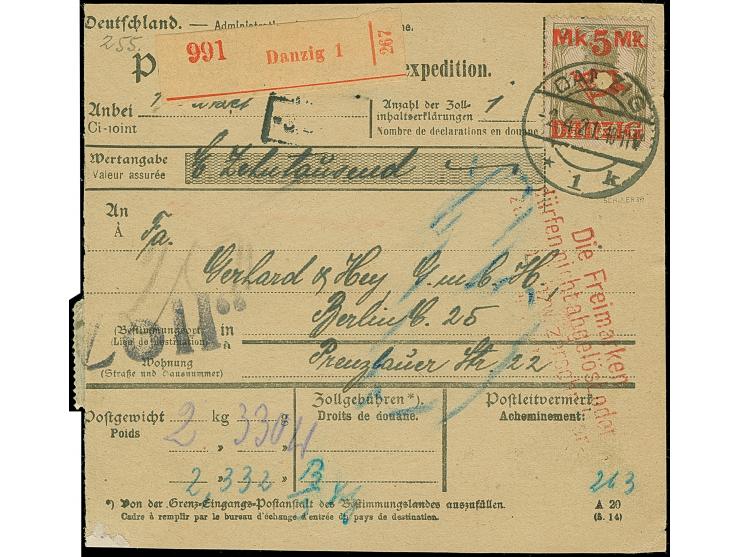 1920, 5 Mark auf 2 Pfennig, Spitzen nach oben, Einzelwert sowie senkrechter Viererstreifen, vorder- und rückseitig, mit Stempel “DANZIG -2.4.21” auf Wertpaketkarte nach Berlin, Marken mit Kontrolllochung, ein Wert des Streifens durch Randklebung etwas bestoßen, sonst tadellos, sign. Infla