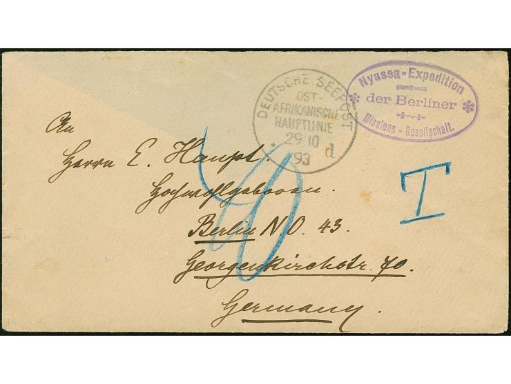 1893, "Nyassa-Expedition der Berliner Missions-Gesellschaft", ovaler violetter Stempel, klar abgeschlagen auf unfrankiertem Briefkuvert mit nebengesetztem "DSP OST-AFRIKANISCHE HAUPTLINIE d 29 10 93"nach Berlin, mit Ankunftsstempel; hier nachtaxiert mit "40" Pfg. Die rückseitige Verschlussklappe fehlt. Ein sehr seltenes Stück.