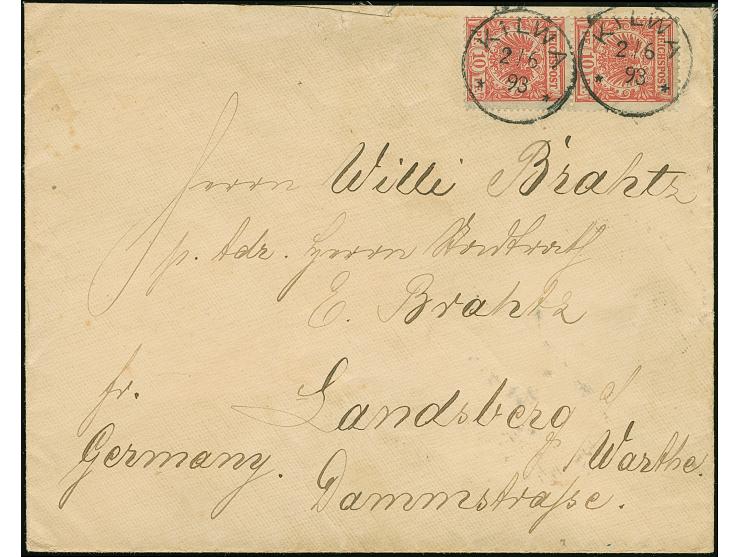 10 Pfg. lebhaftlilarot im senkrechten Paar, mit jeweils sauber aufgesetztem "KILWA 2/6 93" auf Bedarfsbrief nach Landsberg/Warthe, mit Durchgangsstempel von Daressalam und Ankunftsstempel.