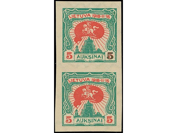1920, Second Anniversary of Independence 5 auksinas green/red, imperforated vertical pair, upper stamp with "double 5 in red and green", mint never hinged, a very scarce and attractive variety
