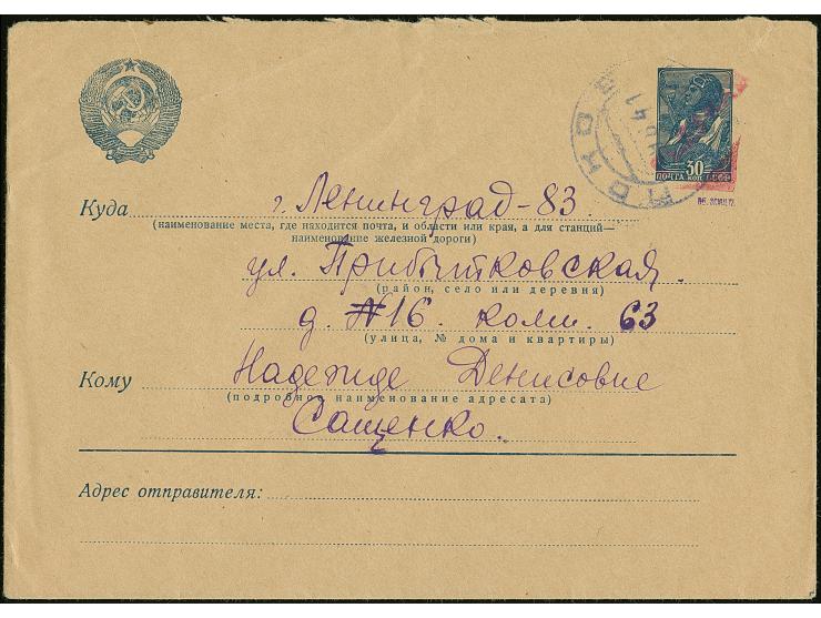 1941, Ganzsachenumschlag 30K. blau mit rotem L1 "PLESKAU" von links unten nach rechts oben, sowie mit violettem Stempel “PSKOW -9.8.41”. Nach der Besetzung Pleskaus erhielten alle Poststücke, die in den Briefkästen vorgefunden wurden, auf Anordnung vor der Beförderung diesen Einzeiler in violett oder sehr selten in roter Farbe, es sind nur wenige Ganzsachen erhalten geblieben, eine der großen Seltenheiten, tadellos, sign. Dr. Schultz sowie Fotoattest Brunel (2022)
