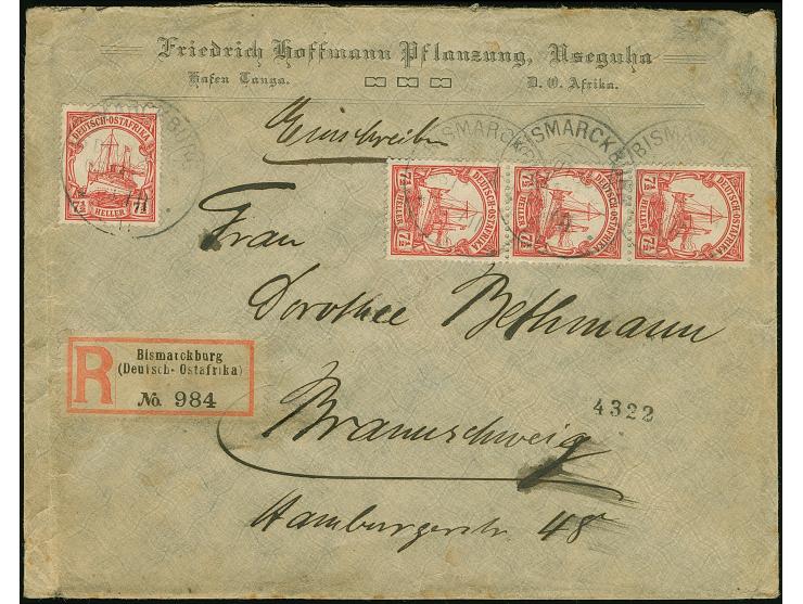 "BISMARCKBURG DOA 1.11.11" mehrfach sauber auf 4 Einzelwert und 3er-Streifen Kaiseryacht 7½ H. auf Bedarfs-R-Brief der Pflanzung Aseguha nach Braunschweig, mit Ankunftsstempel. Leichte Beförderungsspuren .