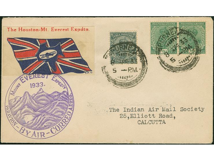 1933, The Houston Mount Everest Expedition: Survey flight by Air Commodore Fellowes over the Himalayas towards Mount Everest, postmarked PURNEA 8 April 1933, Union Jack label and violet cancel "MOUNT EVEREST EXPEDTN 1933 PAR AVION BY AIR CORREO AEREO" alongside, on reverse arrival mark Calcutta 10 Apr.33 and signed Stephen Hutt Smith, only 87 covers carried on this flight, very fine.
