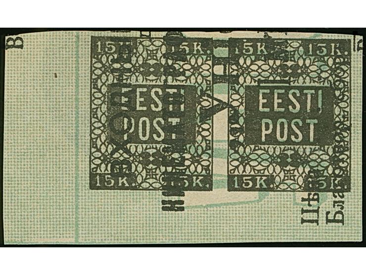 1918, Flower issue 15 kopeks black, Proof printed on front of cinema ticket, horizontal pair from the lower left sheet corner, no gum as issued, fine  (Hurst/Ojaste 2 G:4)
