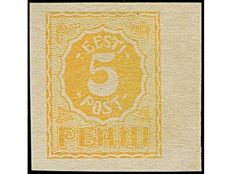 1919, Numerals 5 penni, three different proofs, black on grey paper, bronze on white paper and lemon-yellow on white paper, bronze stamp small crease, otherwise fine, yellow signed Nemvalz and Eichenthal and two certificates Löbbering BPP (2014) (Hurt/Ojaste 6 G:20, G:25, G:26)