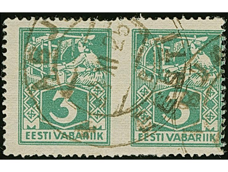 1922, Craftsmen 3mark, horizontal pair, imperforated in between, used, few short perfs and faint crease, otherwise fine, very rare (Hurt/Ojaste A:2)