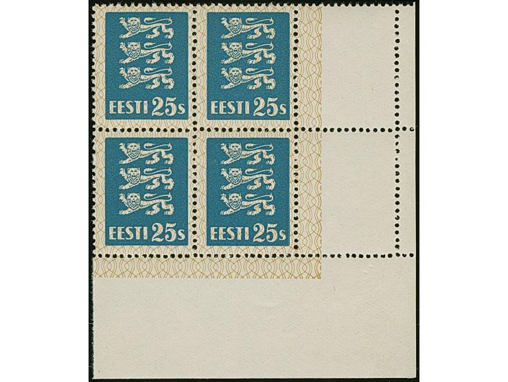 1935, Coat of arms 25 senti, block of four from the lower right sheet corner, with two stamp-sized and fully perforated blank field, mint never hinged, very fine, scarce