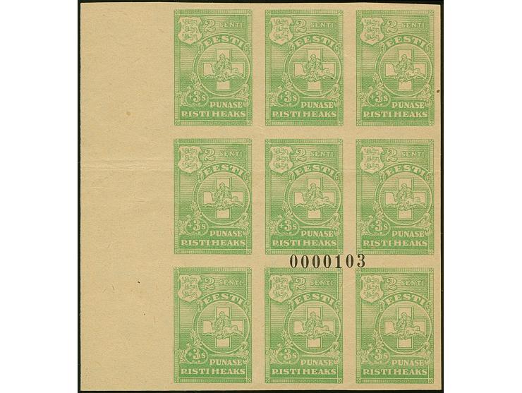 1931, Red Cross 2senti, proof, block of nine from the top left corner. The 7-digit number "0000103" on the proof is of the same size and font as on the 10 Krooni banknote of 1928, also printed at the State Printing Office. The proofs were most likely printed on left-over sheets of trial prints of the banknote numbering machine. In addition a 10 Kr. banknote of 1928 with two banknote numbers, overprinted "PROOV" in red. An exceptional show piece, horizontal crease, otherwise fine, without gum, very fine (Hurt/Ojaste  G:2)