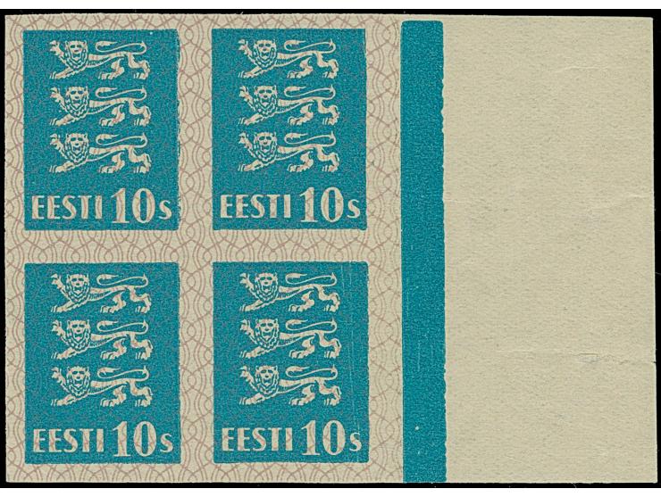 1928, Coat of Arms 10 senti, turqoise-blue, imperforated block of four with burelage and horizontal strip of three with upper sheet margin without burelage, mint never hinged, minor crease in the margin only, very fine
